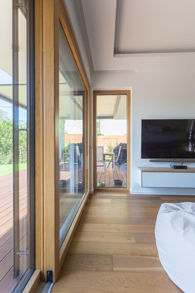 Gama de produse culisante cu ridicare poate fi realizata din profilele de lemn de 92 mm, asigurand un efect natural si armonios.